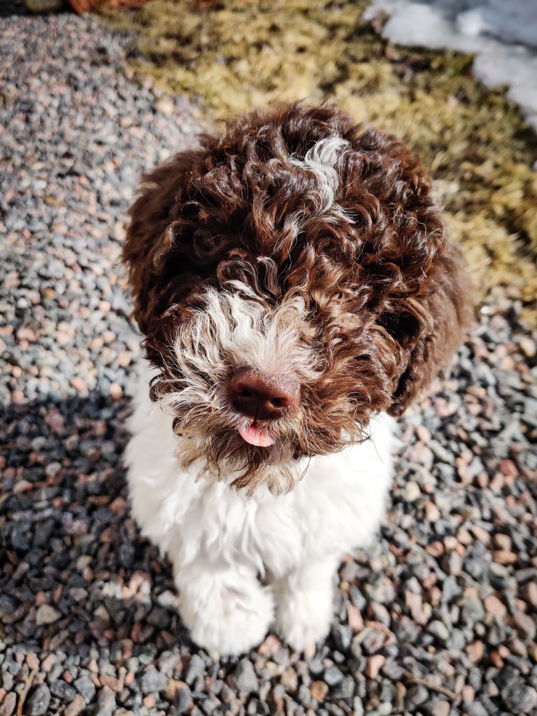 Tämän talven kohokohta koirailuissa oli ehdottomasti monivuotisen haaveeni toteutuminen, Verna! Verna on siis lagotto romagnolon pentunen, jonka kävin Italiasta hakemassa reilu kuukausi sitten. Hyvästi kunnolliset yöunet -tervetuloa pissa-kakka-ralli. Onneksi asumme paritalossa maantasolla, niin riittää kun vain avaa oven pihalle, jotta penska pääsee tarpeilleen. Ei ole kyllä ikävä niitä vuosia, kun kerrostalossa asuimme ja oli pentu opetettavana sisäsiistiksi. Vernukkaisen kanssa olisi tarkoitus harrastella nenänkäyttöjuttuja kuten nose workia -toivottavasti löytäisimme joskus myös kotimaisia tryffeleitä maastosta!